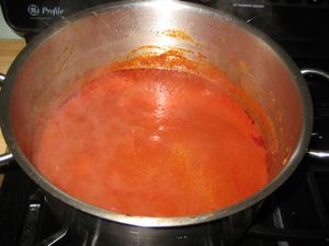 - Add one large canful of water and two cans of tomato paste, stir.