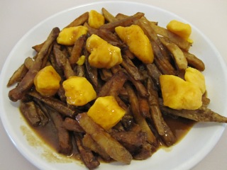 I threw this together in 15 minutes (simple math, but the order of operations — fries, then curds, then gravy — has to be observed), and it tasted better than my first exposure to the Quebecios national dish, but not as good as the platonic ideal served at Au Pied de Cochon. Still, after an hour of shoveling snow it really hit the spot.