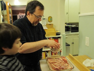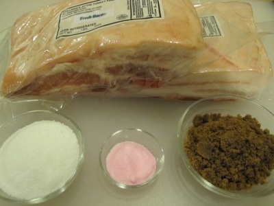 Last week I indicated that the two pork bellies from my meat CSA were destined to become bacon. He Who Will Not Be Ignored expressed an interest in helping me, so it was time for a lesson about Where Food Comes From. We began with the Maple-Cured Smoked Bacon recipe from Michael Ruhlman’s Charcuterie: The Craft of Salting, Smoking, and Curing, two pork bellies, fifty grams each of kosher salt and dark brown sugar, and twelve grams of pink salt (salt and sodium nitrite, also know as InstaCure #1). We chose to omit the maple syrup, preferring a more savory bacon.