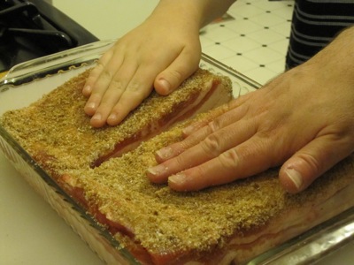 We placed the belly skin side down in a glass baking dish, then I sprinkled the cure mixture over all of the surfaces. (Look carefully at the bookshelf below my arm, you’ll see the spot where Carcuterie belongs, between Richard Olney’s Variety Meats and Fergus Henderson’s The Whole Beast.)