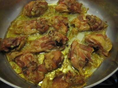 I began with two pounds of chicken thighs that I hacked in two with a cleaver. I placed them in a large skillet which went into a 450 °F oven for an hour, until they were browned.