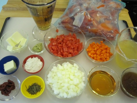 After a bit of chopping and measuring I assembled my ingredients: a cup of white wine; the leftover lobster shells;Â four tablespoons of softened butter; a tablespoon of lobster tomalley (liver); a cup and a half of chopped, peeled, seeded tomatoes; a medium carrot, diced; a minced clove of garlic (not shown); a cup of lobster stock (paradoxically, making lobster stock requires lobster stock); a tablespoon and a half each of softened butter and flour; a tablespoon of tomato paste; a teaspoon of dried tarragon; a medium onion, diced; half a cup of cognac; and half a cup of beef stock.