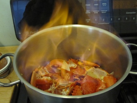 I added the shells to a pot filmed with olive oil and cooked them over high heat for three minutes before adding the carrot and onion. After another three minutes, I added the cognac and flamed it. Fire! Heh heh, fire!
