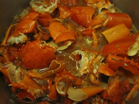 The tomalley butter went into the fridge. I strained the shells and vegetables out of the stock, passing it twice though a fine sieve and reserving the shells. I whisked the beurre manié into the stock and simmered it until lightly thickened, ending up with a cup and a half of sauce à l’américaine.