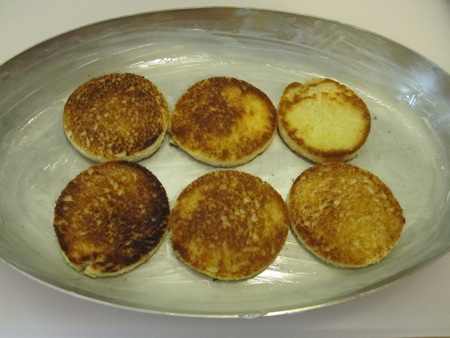 I smeared butter in an oval baking pan and lined it with six croutons made from white sandwich bread. I also pre-heated the oven to 425 °F.