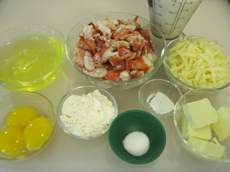 While the stock for the sauce simmered, I assembled the ingredients for the soufflé: five egg whites, lobster meat from three tails and a dozen claws (about ten ounces), a cup of whole milk, three quarters of a cup of coarsely grated swiss cheese, three egg yolks, three tablespoons of flour, a half teaspoon of salt, a quarter teaspoon of cream of tartar, and three tablespoons of butter.