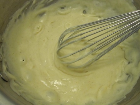 Off heat I whisked in the hot milk, then added the salt and some white pepper. I brought the resulting béchamel to a boil, stirring for one minute.