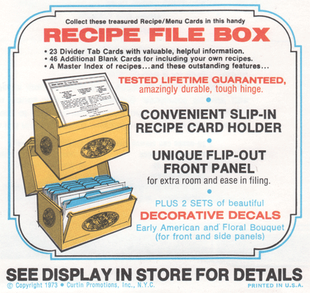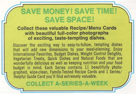 This final bit of information also provides a possible explanation for how we came into possession of the cards. Either this set was offered as a free promotion at a local supermarket, or my mother in law bought the set out of curiosity. Not seeing any recipes she liked – and I assure you she never would have cooked any of them – she filed the set away, where it gradualy migrated to the basement and became part of the geologic strata that would eventually be revealed decades later as the result of flooding.