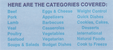 These cards were stored in a box in a cool basement, so we can’t attribute the photographic awfulness to fading or degradation. The food was supposed to look that way. However, despite the snarktastic comments, I want to point out that very few of these recipes use canned ingredients, which, for 1973, is a major achievement. The cards are also organized into categories, which are reproduced on the back of the envelope: