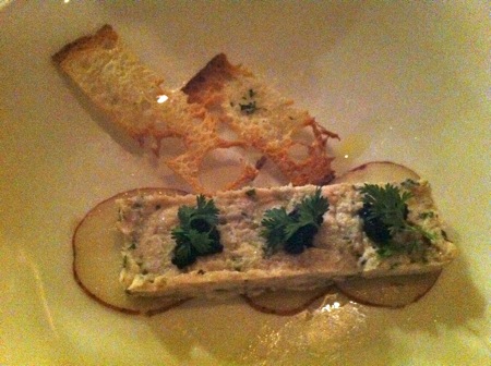 Tuna “confit” on baby red bliss potato slices, topped with hackelback caviar and chervil, accompanied by toast crisps. Not really a confit, more accurately a rillette, but nicely balanced and not too salty.