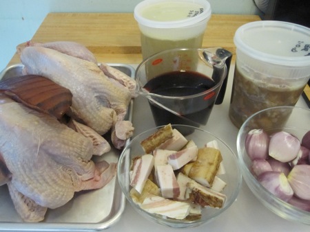 With the correct number of the main ingredient, I assembled the rest: bacon rind, a quart of salted duck stock, a bit more than a pint of trotter gear, half a bottle of red wine, fourteen whole peeled shallots, and a pound of slab bacon cut into chunks.