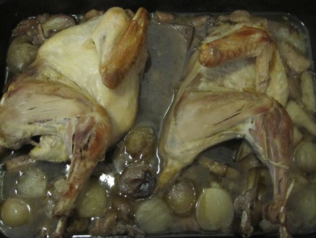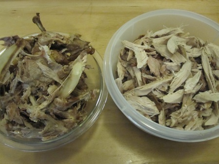 I covered the pan with foil and placed it n a 325°F oven for two hours. When the braise was finished, I removed the pheasants, let them cool, and picked all of the meat from the bones.