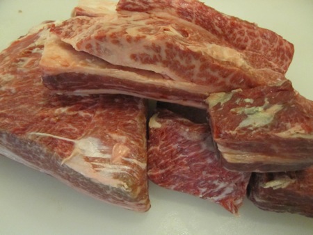 If you can publish a six-volume state-of-the-art genre-defining cookbook, you probably have access to ingredients unavailable to us mere mortals. In this case, the platonic ideal ingredient was a four-bone plate of short ribs of uniform thickness, with a minimal fat cap and perfect marbling throughout. My butcher had three-bone plates that tapered significantly at one end, so I doubled up and bought eight ribs worth, knowing that I’d be able to get at least one meaty chunk from each bone.