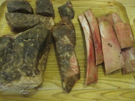 I started the ribs on a Monday, so by Thursday they were ready. I removed the bags from the water bath, chilled them quickly in ice water, then cut open the bags and slipped the bones out of the meat.