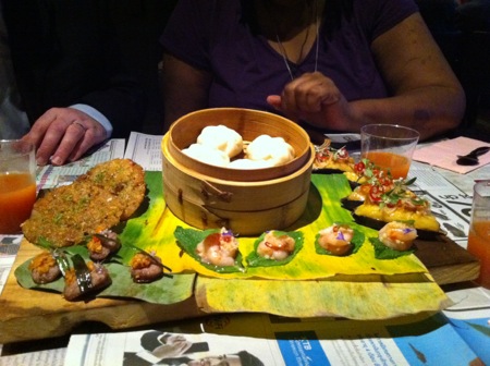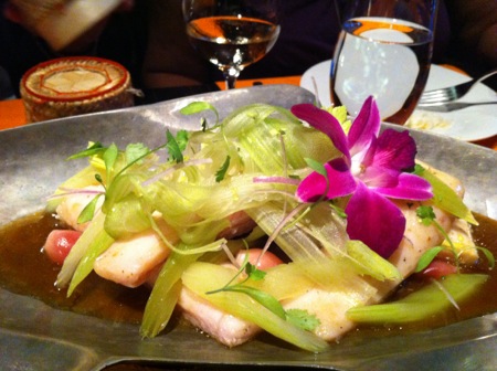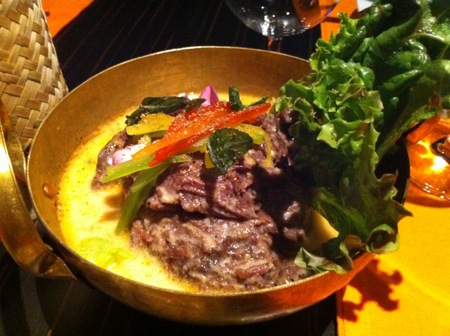 The steamed buns were filled with green curry pastes, the bananas (to which the spoons were applied) were garnished with chilis. A fun start to the meal, which changed over to a cloth runner (the color determined by the day of the week) and silverware for the more formal courses to follow.