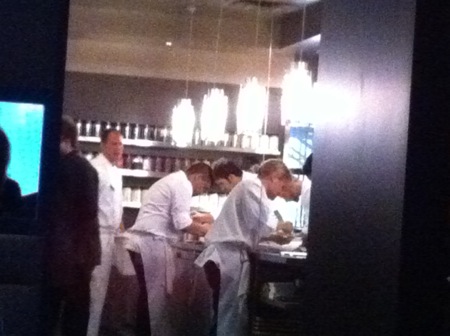 When making reservations at Next, you have the option of booking the “kitchen table” for six, which isn’t in the kitchen, but just outside it, separated by a glass wall: