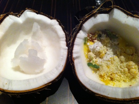 Whole cracked coconuts were placed before us and we were instructed to lift the tops off and set them next to the bottom half. Our waiter spooned coconut water ice into the empty lid while describing the contents of the full half: corn pudding, candied lime, licorice tapioca pearls, and sweet cooked egg noodles. All of the expected food manipulations missing from the previous courses were collected in this one dessert – freeze-drying, powders, gums, and liquid nitrogen freezing (the exhaustive list is in this article) – to make a memorable assault on the senses.