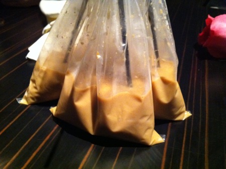 I don’t have a photo of this palate cleanser, a few sips of watermelon juice infused with lemongrass.The drink was a pale, clear green, which leads me to believe that the watermelon essence had been distilled with a rotary evaporator (a standard kitchen tool at Alinea). It tasted more of the rind than the fruit, but was very refreshing.