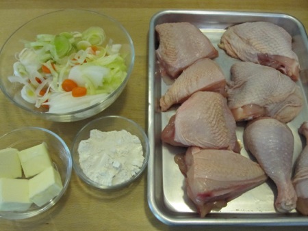 I started with a cut up chicken, mirepoix, four tablespoons of butter, and three tablespoons of flour.
