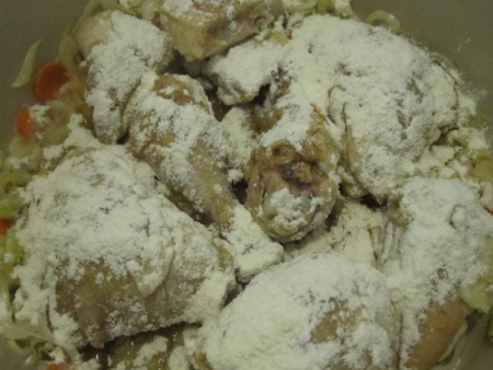 I sprinkled the chicken with flour, salt, and white paper, making sure it was evenly coated, then let it cook for an additional four minutes.