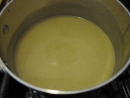 After half an hour of simmering, I removed the chicken from the pot and brought the liquid to a boil, reducing it until it thickened. I slowly ladled the liquid into a mixture of two egg yolks and half a cup of cream, whisking the entire time to prevent the eggs from curdling.