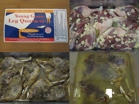 I had made goose leg confit before, using a recipe by David Rosengarten. It required a brief salting followed by a shallow low-temperature poach in duck fat. It didn’t have to be perfectly falling-off-the-bone tender since it would be braised for at least three additional hours. I also discovered that all goose legs come from the same place, whether you have your butcher order them or if you buy them directly.
