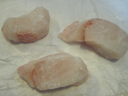 Scaling down the basic proportions, I visited my local fishmonger to buy a pound and a half of mussels and three thick six-ounce cod filets. He was out of cod, but suggested I try hake loin instead. I agreed, told him the size and thickness I needed, and watched in awe as he butchered an entire hake to make the filets. In less then three minutes. When I got home with the hake, I salted the pieces generopusly and let them sit for five minutes.