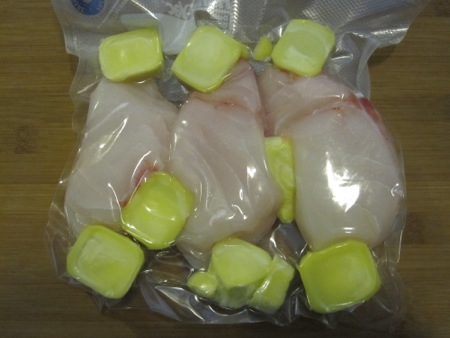 The recipe requires poaching the fish in a quart of olive oil, which I thought would be wasteful. A few hours before buying the fish, I portioned a cup of olive oil into an ice cube tray and let it freeze. When it was time to rinse off the salt and dry the fish, I added it to a sous vide bag along with the frozen oil, solving two problems at once: not gunking up my vacuum sealer with oil, and being able to have the bag ready in advance of when it needed to be cooked.
