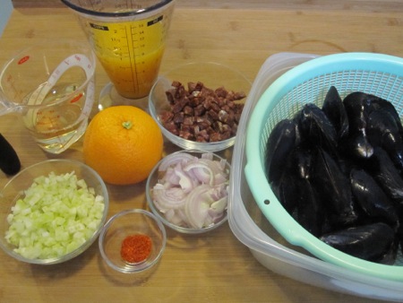 I assembled the rest of my ingredients: four ounces of chopped chorizo, a thinly sliced large shallot, a half cup of finely chopped fennel, a quarter teaspoon of piment d’Espelette, a half cup of wine, a cup of fresh orange juice, a whole orange, a cup of chicken stock (not shown), and the mussels.