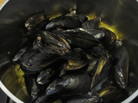 After removing the cooked chorizo, I sweated the fennel and shallots, then added the mussels and wine and cooked until the shells opened.