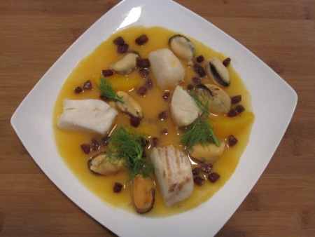 I was looking for a recipe that incorporated the Spanish chorizo I had made when I noticed a feature in Food and Wine about “iconic chefs.” It’s hard to argue with the list, one chef chosen for each decade of age (including Achatz, Flay, Keller, Puck, Jaffrey), but the recipes associated with each chef are what caught my interest, in particular, Thomas Keller’s contribution. “Olive-Oil Poached Cod with Mussels, Orange, and Chorizo” not only looked delicious, but it would be simple to prepare.
