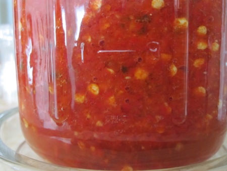 After a few more days, I noticed that the pepper pulp was floating on top of clear red liquid. I continued to stir each day until the level of the peppers in the jar stopped rising. I added the peppers to a blender along with half a cup of white vinegar and puréed the mixture until it was smooth.