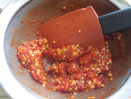 I pushed the purée through a fine-meshed strainer, making sure to force through as much pulp as possible, leaving only seeds and pith behind.