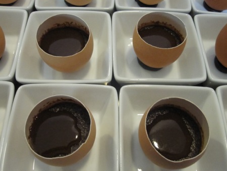 Since he enjoys a favored status as the primary contributor to the Belm Collection of Unusual Food, I decided to add a chocolate amuse to the menu. Again, I chose it from On the Line, having seen it last year and filed it away as something I wanted to try. Despite its lengthy full name – “Egg,” Milk Chocolate Pots de Crème with Caramel Foam, Maple Syrup, and Maldon Sea Salt – the recipe was mostly do-ahead steps. The most difficult part would be  preparing the egg shells.