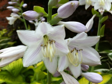 A few years ago one of my neighbors – I call him The Mayor of Columbus Avenue – Â convinced me to tear out the privet hedges that surrounded Chez Belm and replace them with lower-maintenance plantings. He donated cuttings from the hostas he grew in his garden, which I have supplemented every year with a new varietal or two. His Honor, being too old to get on his knees and help, provides horticultural supervision punctuated with jabs of his walking stick. While supervising my recent weeding session, he said “I see the day lilies are really thriving.”