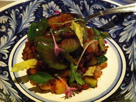 I’m used to caponata being primarily olive-based, but this version included celery, zucchini, pine nuts, and a bit of bittersweet chocolate in the sauce.