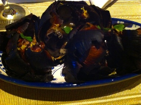 The carciofi alle brace – grilled artichokes – are traditionally cooked over a wood fire. We were informed that this version was prepared “on a Weber kettle in the back.” After scooping out the tender heart, I had to remember how to eat the leaves, which is where the smoky flavor was concentrated (before being transferred to my oily fingers).