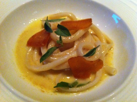 Fresh pasta in a light butter sauce, garnished with two versions of bottarga (dried grey mullet roe): the traditional dried form was grated into the sauce, while a cured form (preserved in beeswax and allowed to age like cheese) was grated over the top. I’d never tried the cured version, it was fishier and creamier than the saltier grated variety.