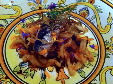 Gemelli pasta and fish is a classic combination; the Sicilian variation uses a grilled sardine filet in place of flaked tuna. The dish was finished with a light tomato sauce and and a drizzle of olive oil.