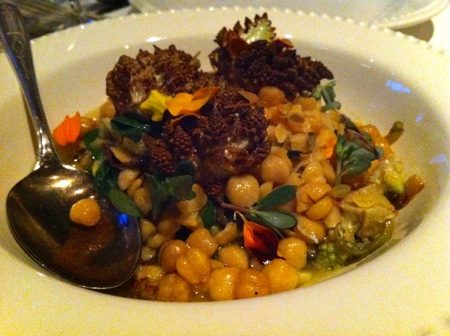 The tomato in this course was provided by the beverage pairing, in this case green tomato juice spiced with garlic and white pepper, assertive enough not to be overpowered by the strong fish and chickpea flavors.