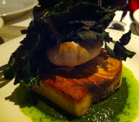 Another fish course, in which the pesce was a thick slab of perfectly cooked swordfish. It was served with a mint pesto and garnished with a head of roasted garlic and a clutch of broiled mint leaves. I’ll have to try that fish/mint paring myself, it was a surprising match.