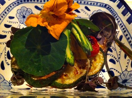 The pork was accompanied by grilled zucchini and cherry tomatoes, shaved asparagus, and nasturtium blossoms and leaves.
