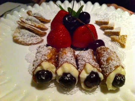 No Italian dinner is complete without pastry miniatures; this was no exception. The fried ravioli encased a sour cherry filling, the cubbaita were little honey-sesame seed cakes. And, of course, some fresh fruit.