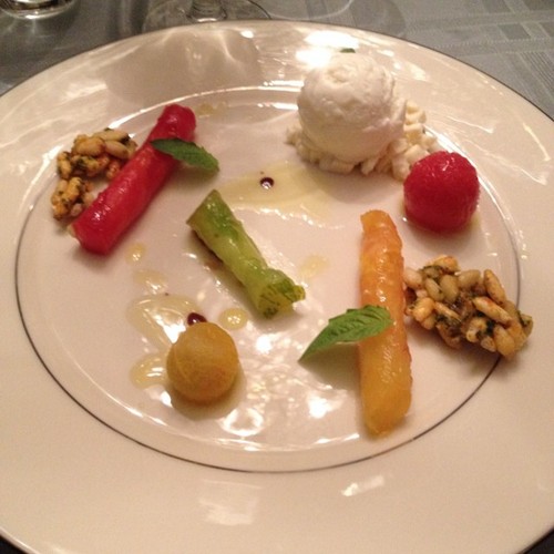 Red, yellow, and green heirloom tomatoes, confited cherry tomatoes, fresh mozzarella, mozzarella ice cream, provencal granola, olive oil, balsamic vinegar.
