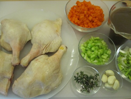 I had four duck legs and two cups of duck stock in the Deep Storage Facility, so I thawed them out and got ready to make a simple but tasty weekend meal. In addition to the legs (trimmed of excess fat, which I later rendered and saved) and stock, I diced a half pound of carrots, three celery stalks, and one leek. I crushed and peeled six cloves of garlic and set aside six sprigs of fresh thyme.