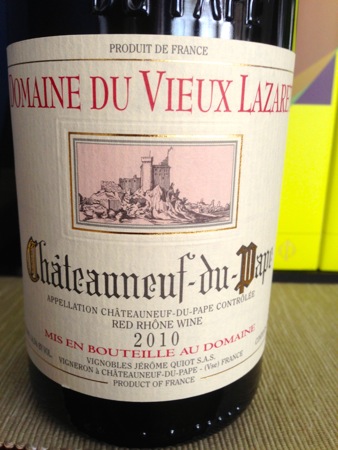 Sous vide-then-seared beef tenderloin, potato mille feuille, grilled king oyster mushroom, spring garlic, pearl onions, bone marrow sauce, and bordelaise syrup. Served with a 2010 Domaine du Vieux Lazaret Chateauneuf-du-Pape.