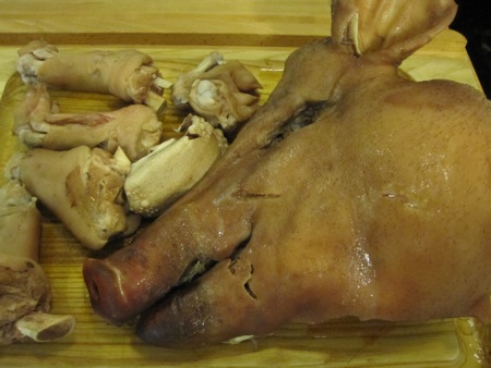 I cleaned the half pig’s head, and augmented it with the tongue and the trotters and hocks left over from my last venture into whole pig cookery, retrieved from the Belm Utility Research Kitchen Deep Storage Facility.