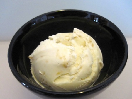 Of the three dishes offered, the most interesting was this “salad” of melon spheres, panna cotta, lime foam, the spherified peas, and salmon roe:
